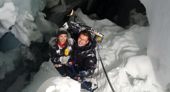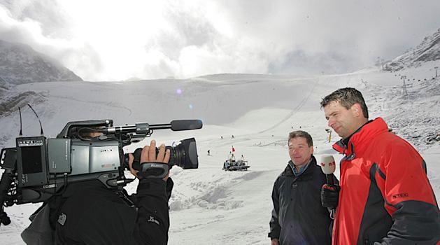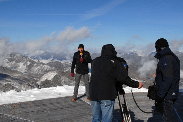 Beim Gipfeltreffen der Wetterfrösche im Ötztal lachte die Sonne und glitzerte der Schnee Kameras am Ötztaler Gletscher, Moderatoren vor dem Aquadome, Meteorologen beim Sichten von Wetterkarten und –prognosen: Das 2. Gipfeltreffen der Wetterfrösche im Tiroler Ötztal fand seinen krönenden Abschluss bei einem Tag, der den Wetterdrehs im ganzen Ötztal vorbehalten war. Bei strahlendem Sonnenschein wurden Wetterbilder vom frisch verschneiten Ötztaler Gletscher in den gesamten deutschsprachigen Raum gesendet. Insgesamt 18 der bekanntesten Wetterfrösche von 15 verschiedenen Fernsehsendern waren am Freitag, 17. Oktober, im Ötztal unterwegs, um im Rahmen des Gipfeltreffens der Wetterfrösche ihre Wettermoderationen live oder aufgenommen in alle Welt zu versenden. Und wenn Wetterfrösche reisen, dann herrscht offensichtlich auch prächtiges Wetter. Denn das Ötztal zeigte sich an diesem Tag von seiner schönsten herbstlich-winterlichen Seite. Nach Schneefall in der Nacht, klarte es am späten Vormittag auf und die Sonne schien über dem Ötztal und Tirol. Frischer Pulverschnee, wenige Schäfchenwolken und die Sonne auf über 3000 Metern Meereshöhe – das animierte die Wetterfrösche zu wahren Höhenflügen in Sachen Wettermoderation. Einem großen Familientreffen gleich hat man sich gegenseitig interviewt, herrliche Wetterbilder aus dem Ötztal eingefangen und scheute sich auch nicht, ungewöhnliche Drehorte zu wählen. So kletterte beispielsweise RTL-Wetterfee Maxi Biewer in eine Gletscherspalte, Cathy Zimmermann vom österreichischen Privatsender ATV war eine von vielen Moderatoren, die mit dem Heißluftballon hoch über Sölden filmten.